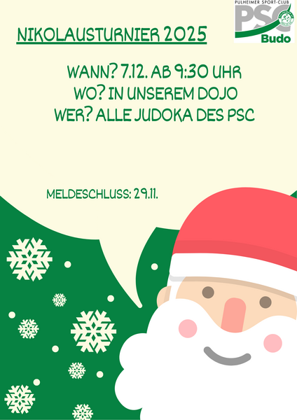 wir freuen uns ganz besonders, Euch auch in diesem Jahr wieder zu unserem traditionellen Nikolausturnier einladen zu können. Lasst uns gemeinsam mit Euren Familien am Sonntag den 7. Dezember mit spannenden Kämpfen, glitzernden Medaillen und köstlichen Leckereien in einer gemütlichen Atmosphäre den Jahresabschluss feiern.