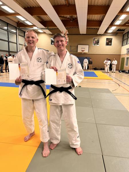 Deniz Trosdorff und Martin Clewing konnten am Ende von Kata, Stand und Boden ihre Urkunden zum 2. DAN nach anstrengenden Stunden entgegennehmen.
